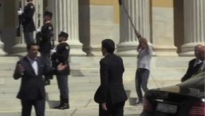 L'abbraccio tra il premier italiano Matteo Renzi e il premier greco Alexis Tsipras: il presidente del Consiglio è arrivato ad Atene per prendere parte alla prima sessione di lavoro dell'incontro tra i leader dei Paesi Ue del Mediterraneo.